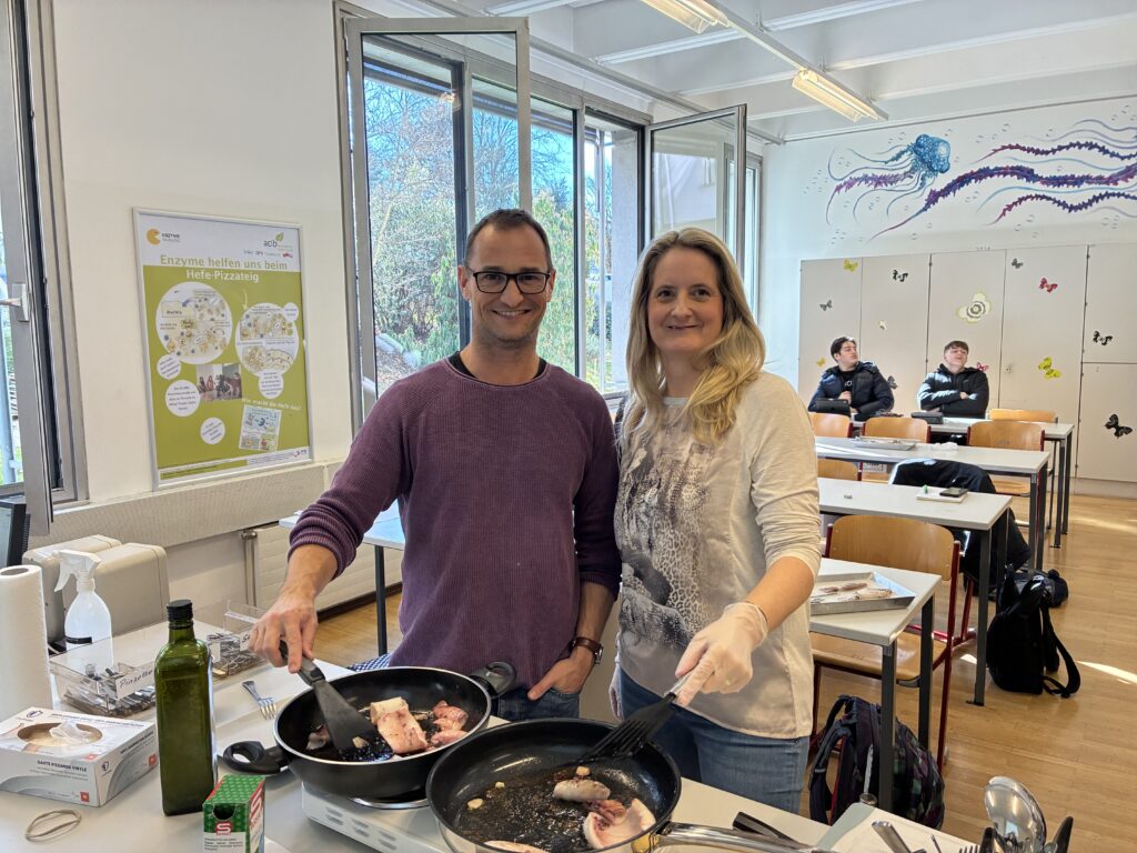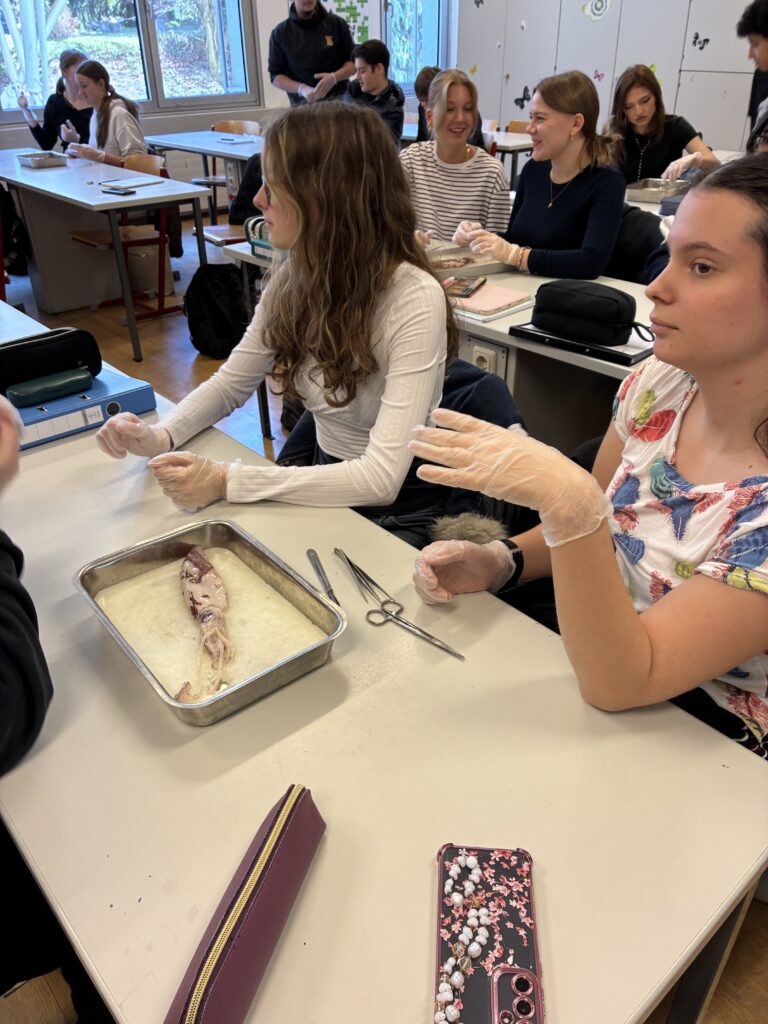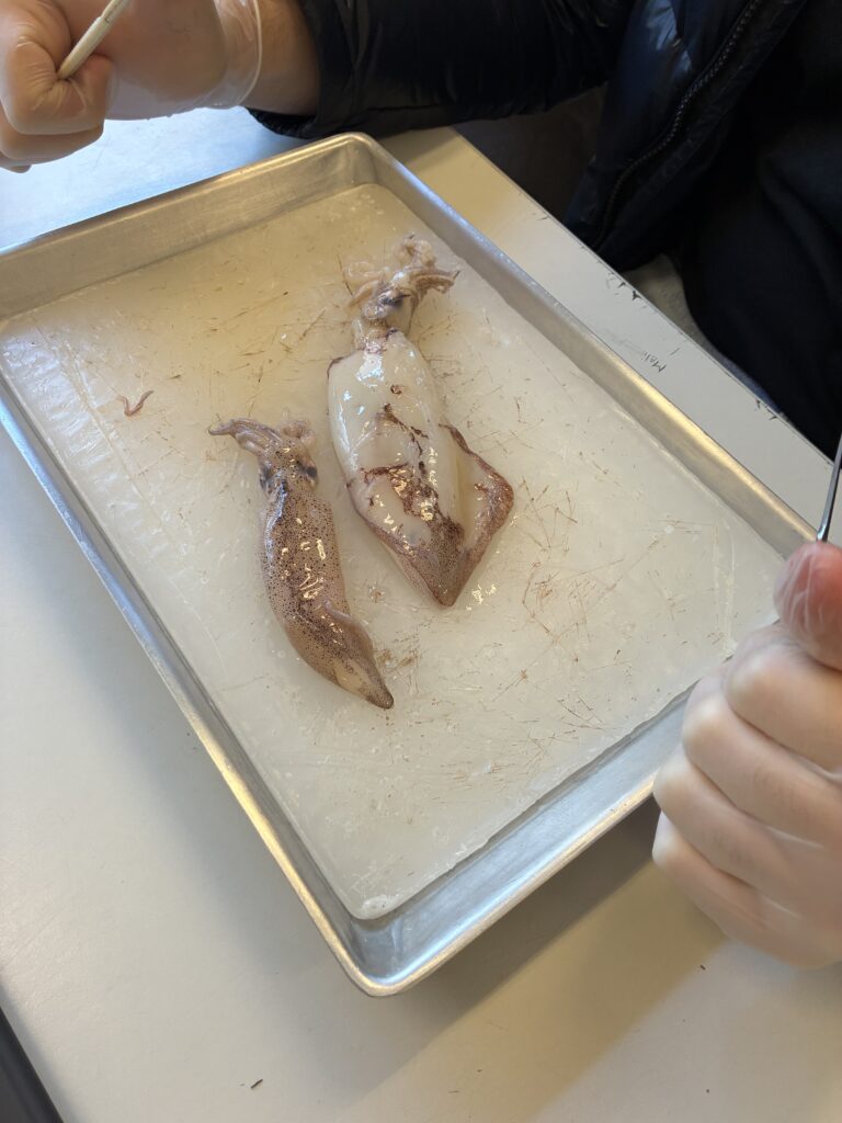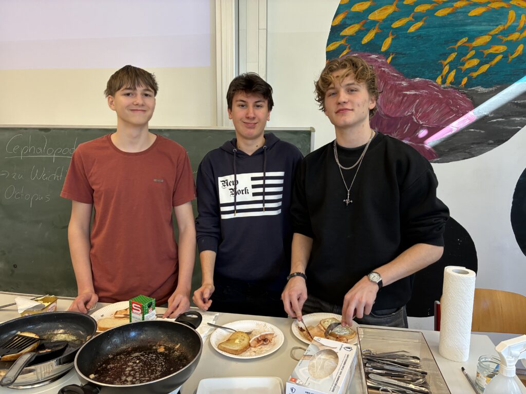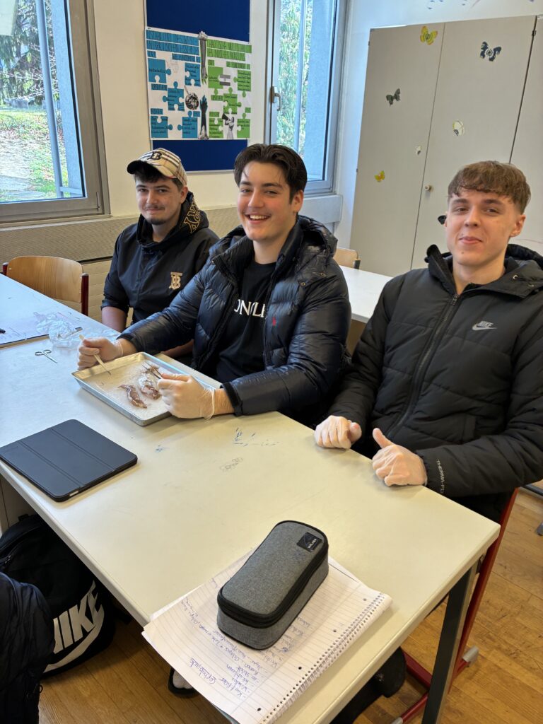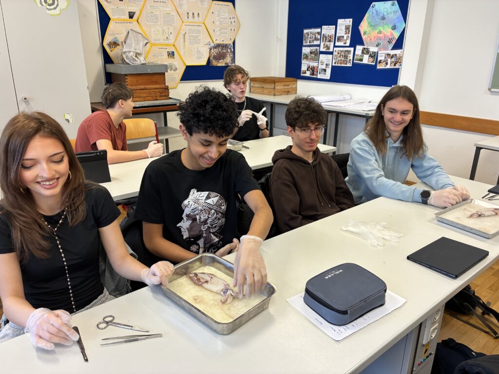 Ein zentraler Bestandteil der Unterrichtseinheit war die Sektion eines Kalmars. Mit großem Interesse und viel Sorgfalt untersuchten die Schülerinnen und Schüler die anatomischen Besonderheiten. Sie identifizierten unter anderem Mantel, Tintenbeutel, den Papageienschnabel und den hornigen „Schulp“. Dabei konnten sie ihr theoretisches Wissen direkt am Präparat anwenden und vertiefen. Besonders beeindruckend war für viele der Aufbau der Augen, die in ihrer Komplexität mit denen von Wirbeltieren vergleichbar sind.